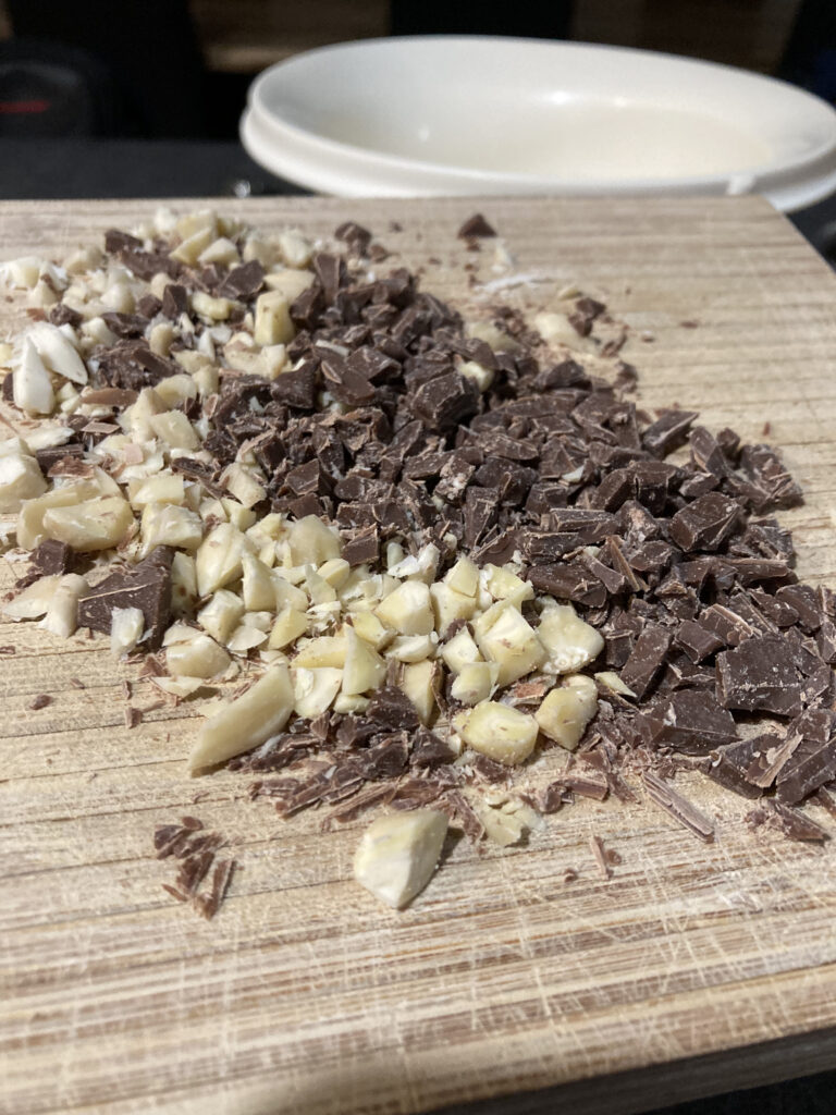 Concasser les amandes et le chocolat, mélanger avec les flocons d’avoine, la farine et la levure.