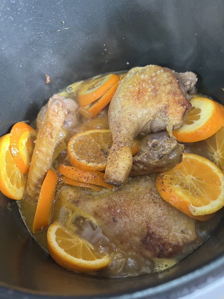 Terminer en ajoutant les tranches des 3 autres oranges et laisser mijoter une bonne 1/2 heure ou 15 minutes dans une cocotte minute ou un cookéo.